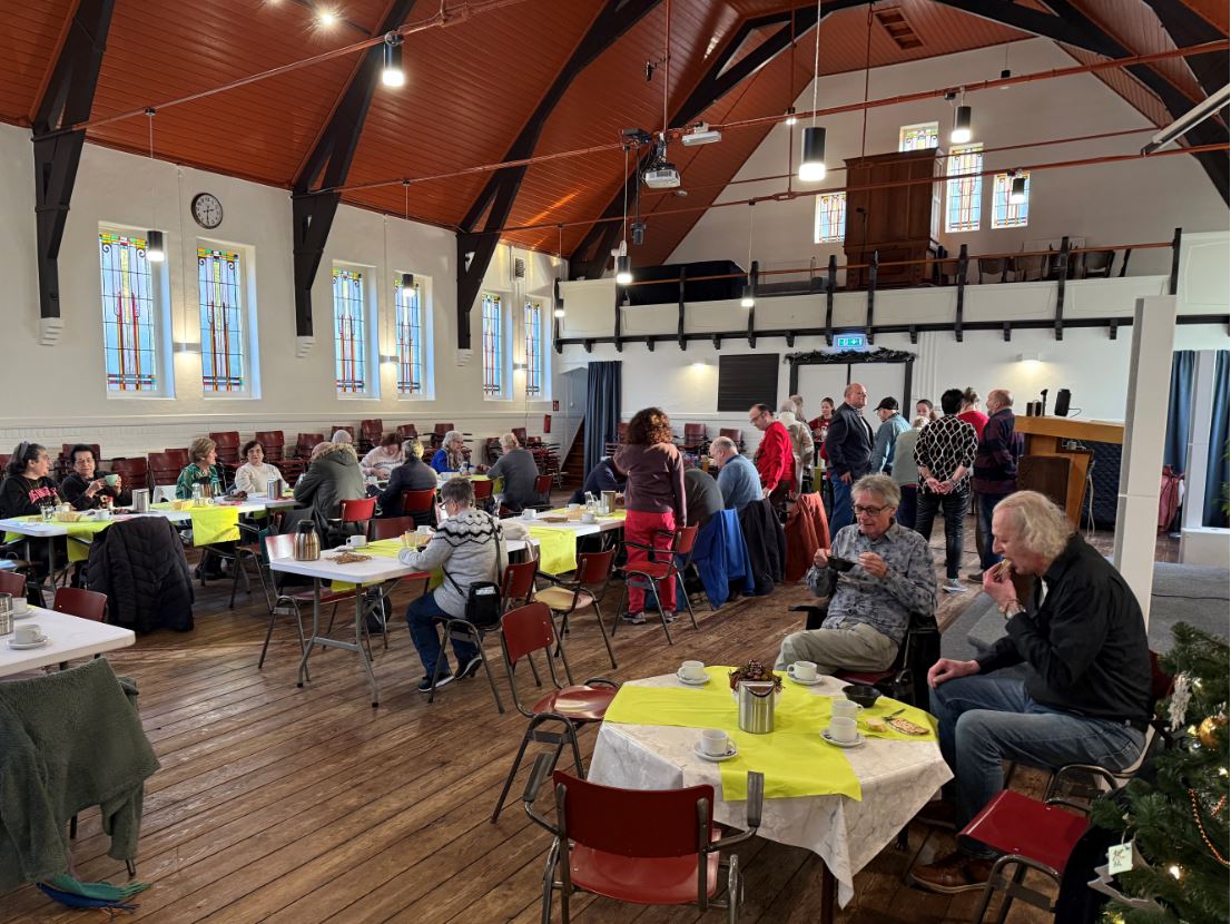 Dit is een ontmoetingsplek voor mensen die alleen zijn, of die andere bagage met zich meedragen. Op deze vaste ontmoetingsplek kunnen zij gezellig kletsen, een spelletje doen of een luisterend oor vinden bij één van de vrijwilligers. Er wordt koffie en thee geschonken en regelmatig worden er koeken door een plaatselijke bakker gedoneerd. Daarnaast wordt met Pasen en Kerst een brunch voor de gasten georganiseerd. De HH biedt ondersteuning in de vorm van het betalen van de zaalhuur voor 2026.